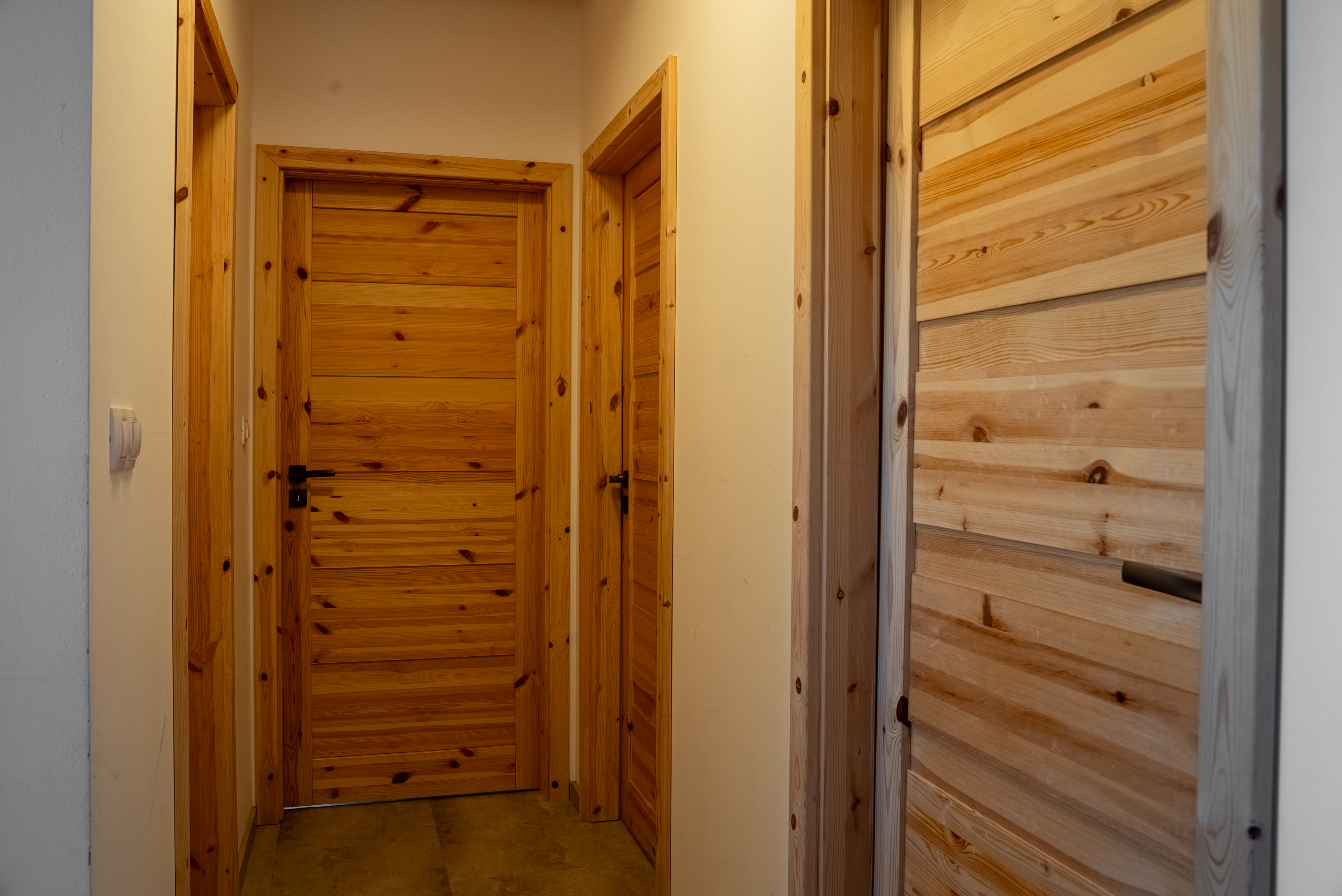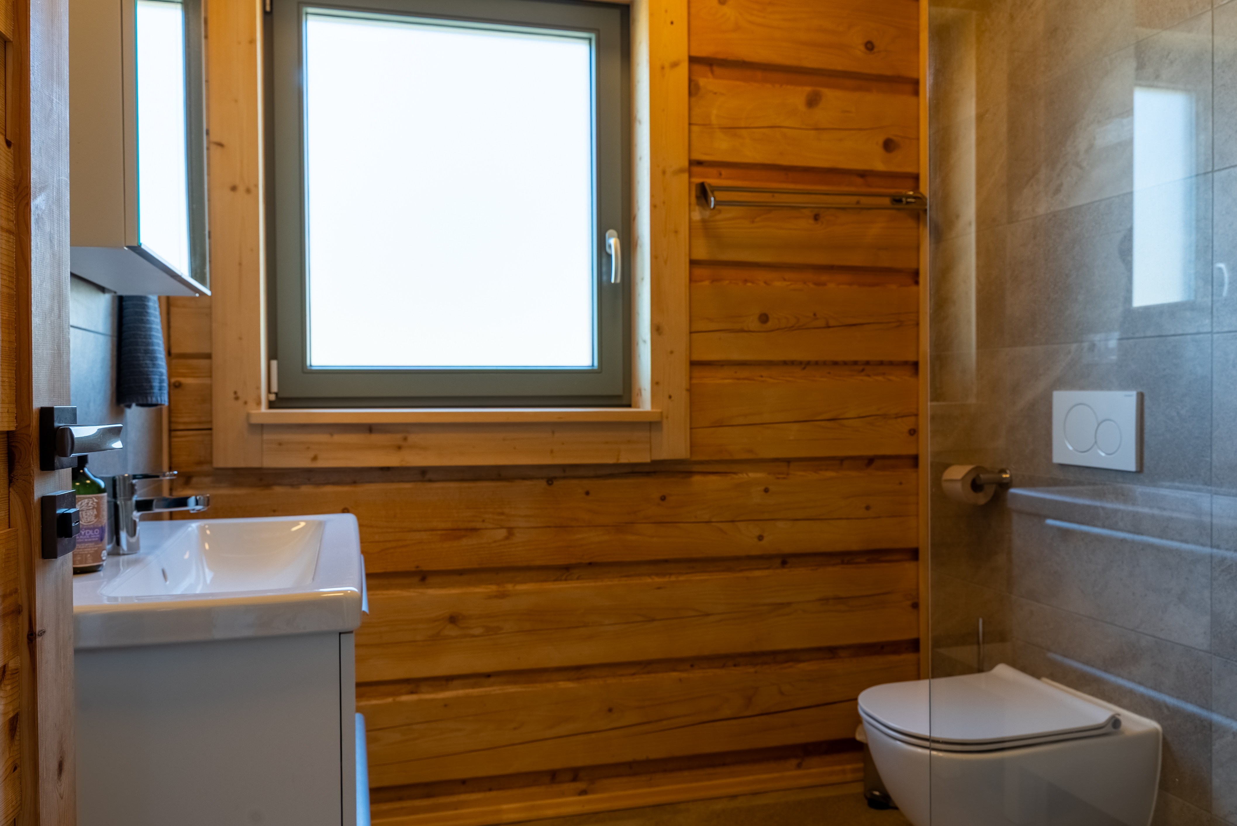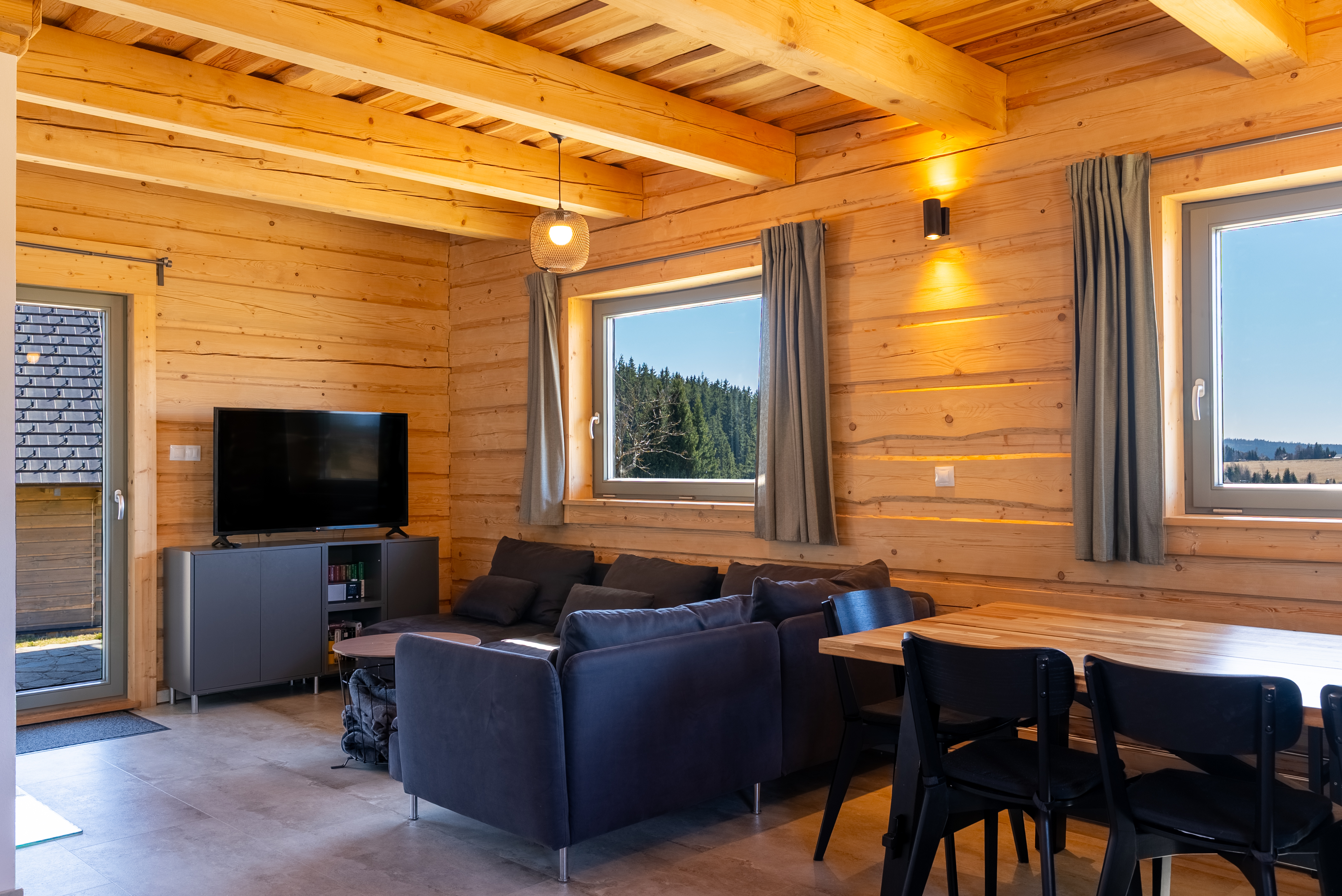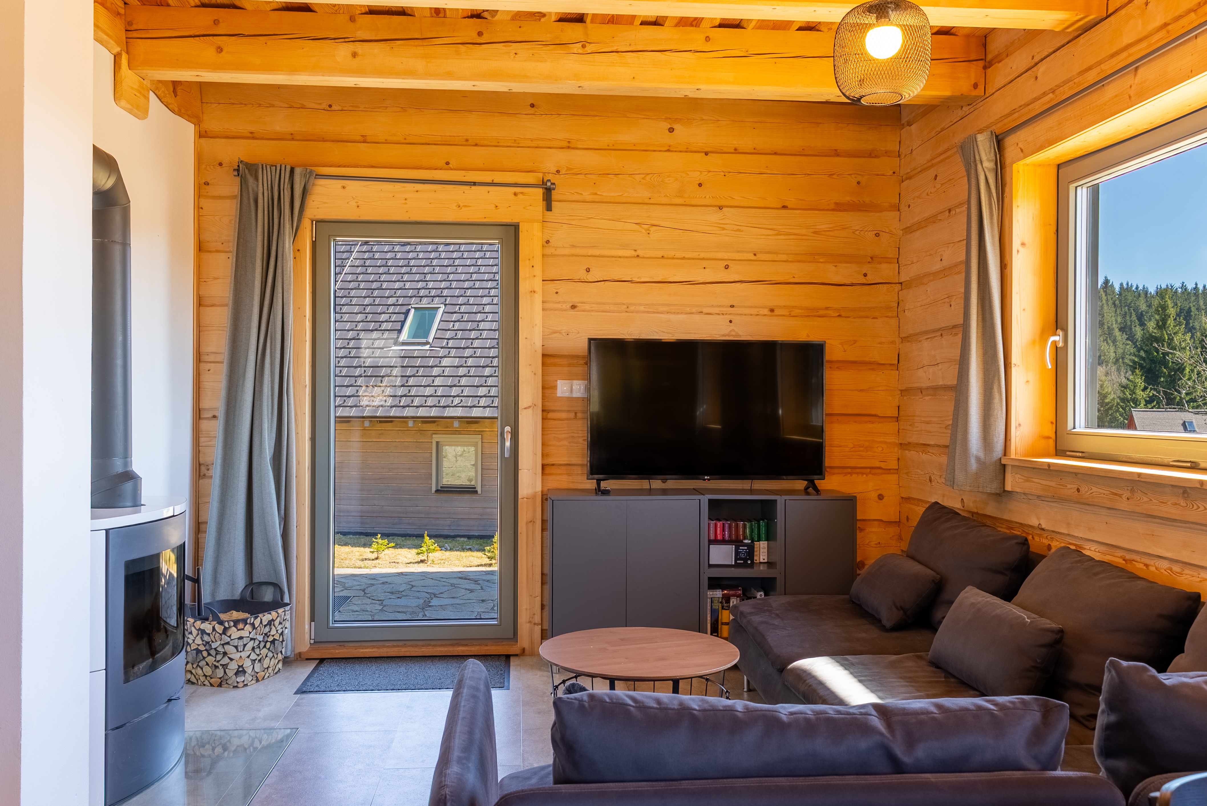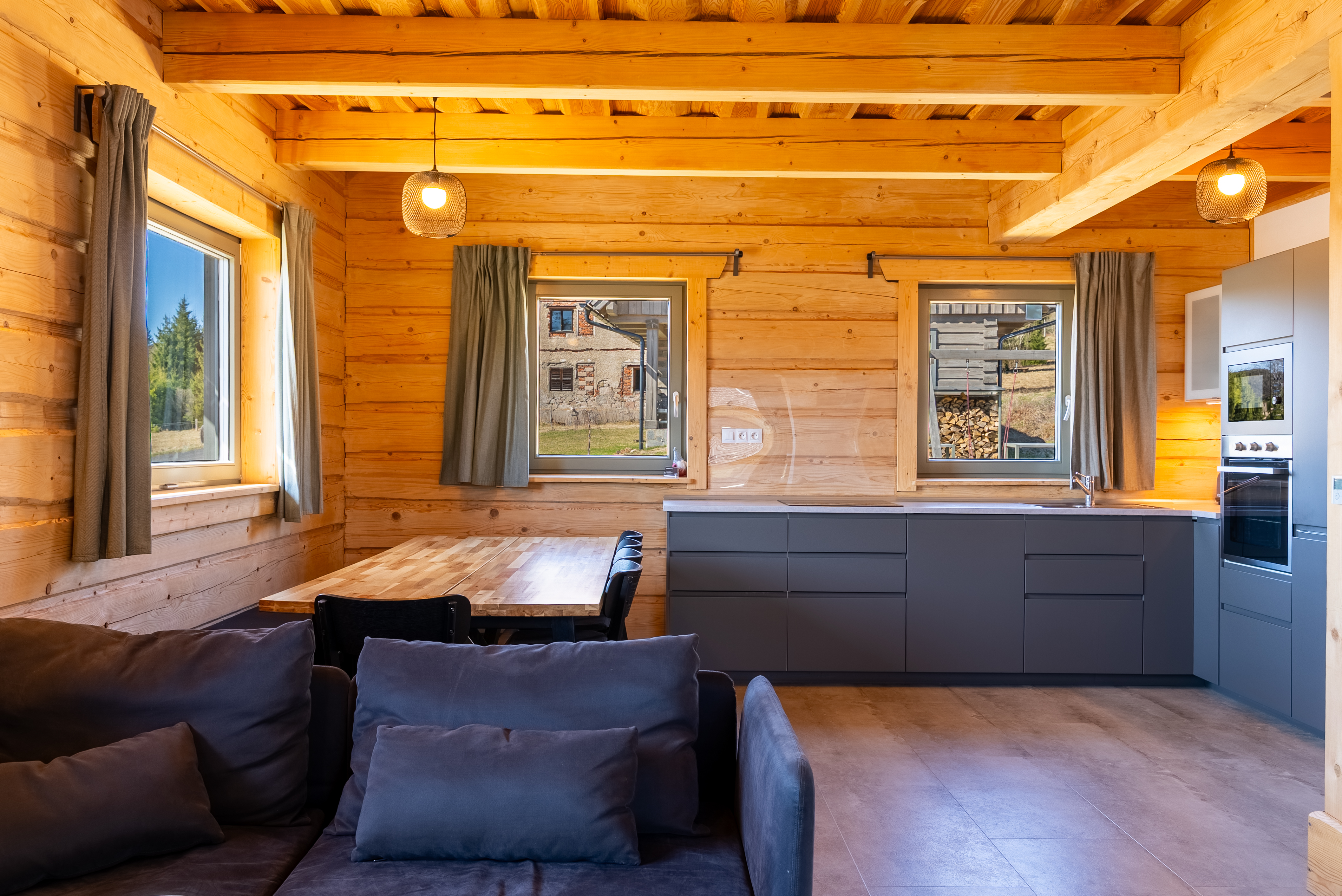 Naše prostřední roubenka je moderně zařízená s veškerým komfortem pro hosty včetně krbových kamen pro radost z pobytu na horách. Lyže, kola i kočárky uložíte v prostorné lyžárně, zaparkujete přímo před domem.
