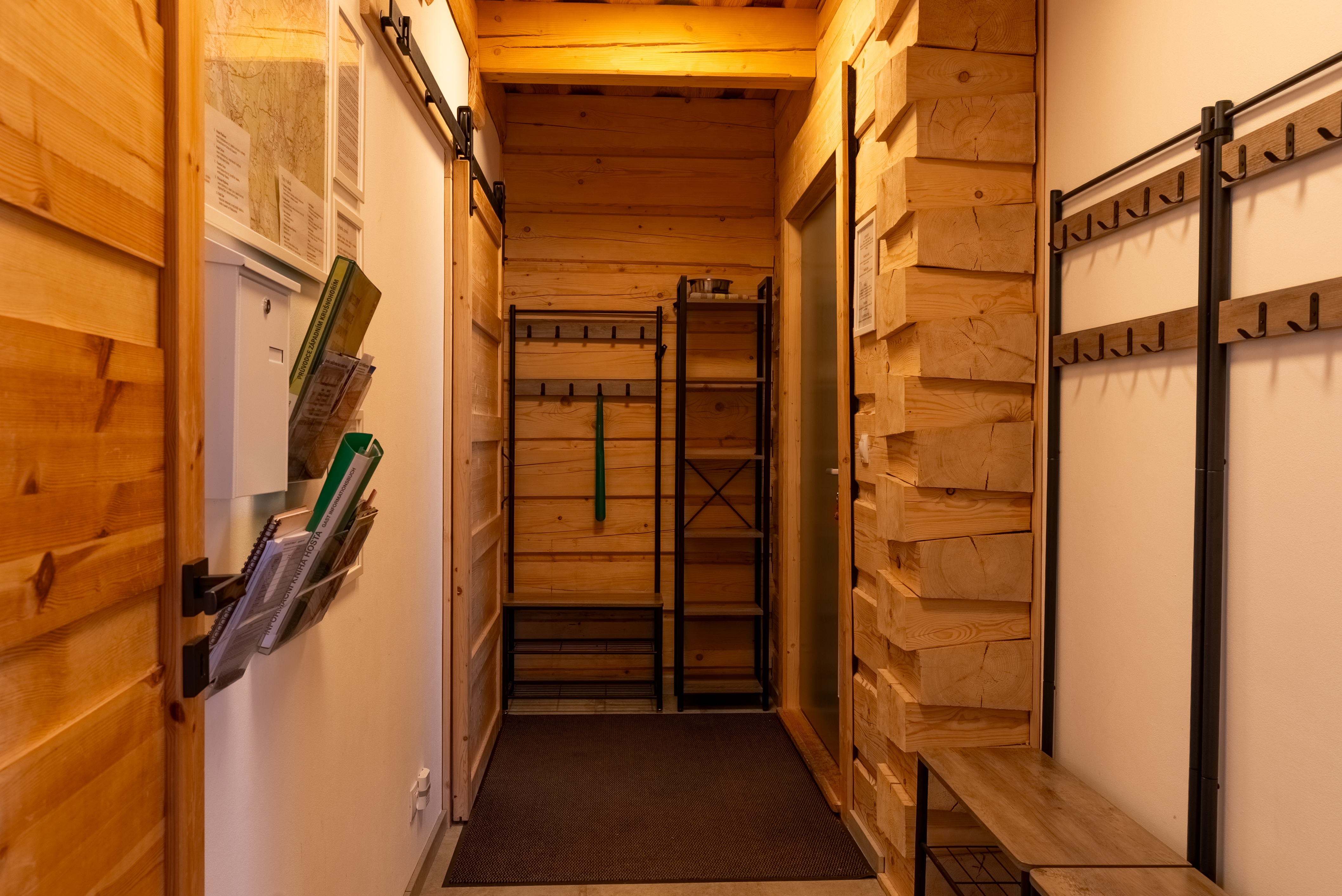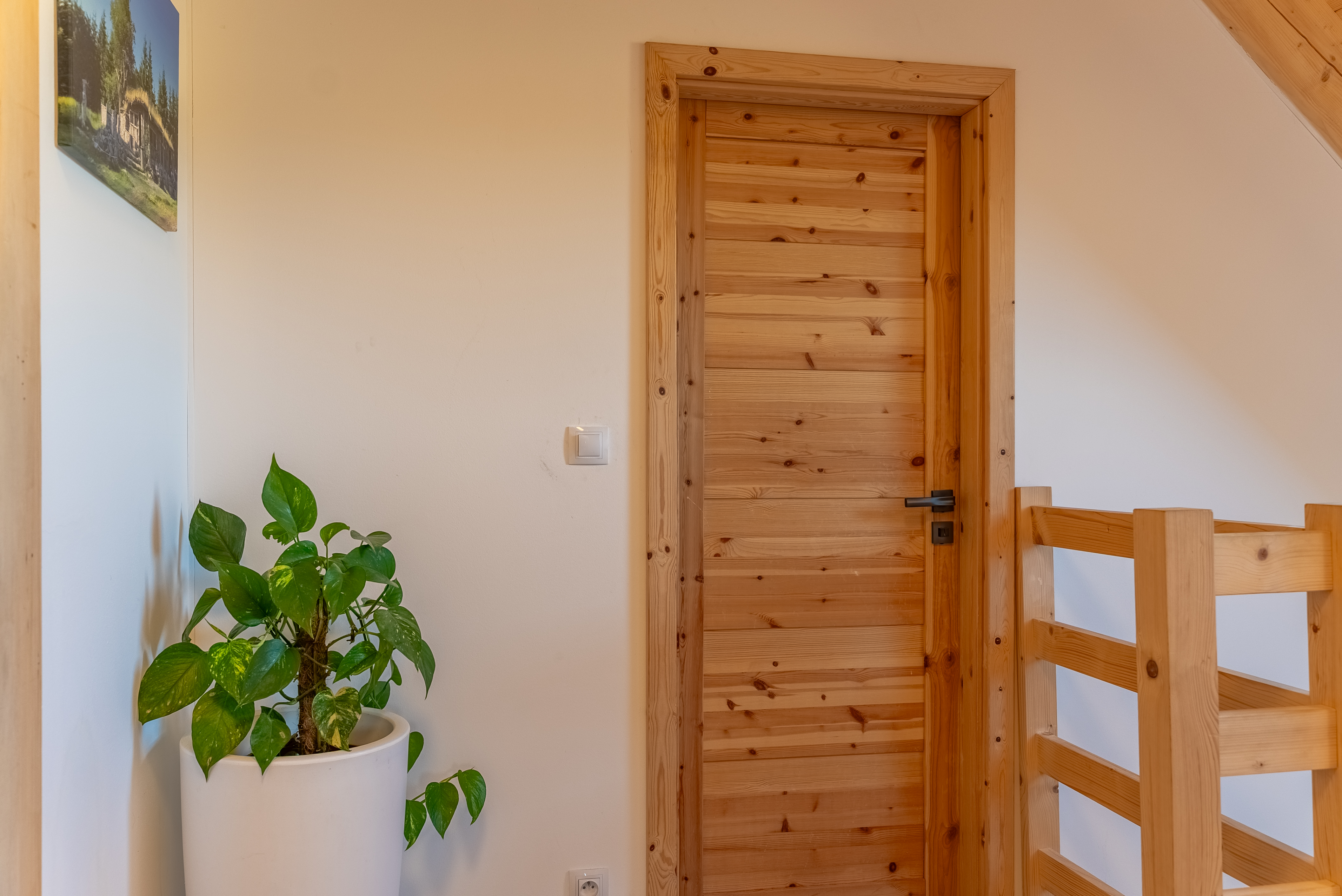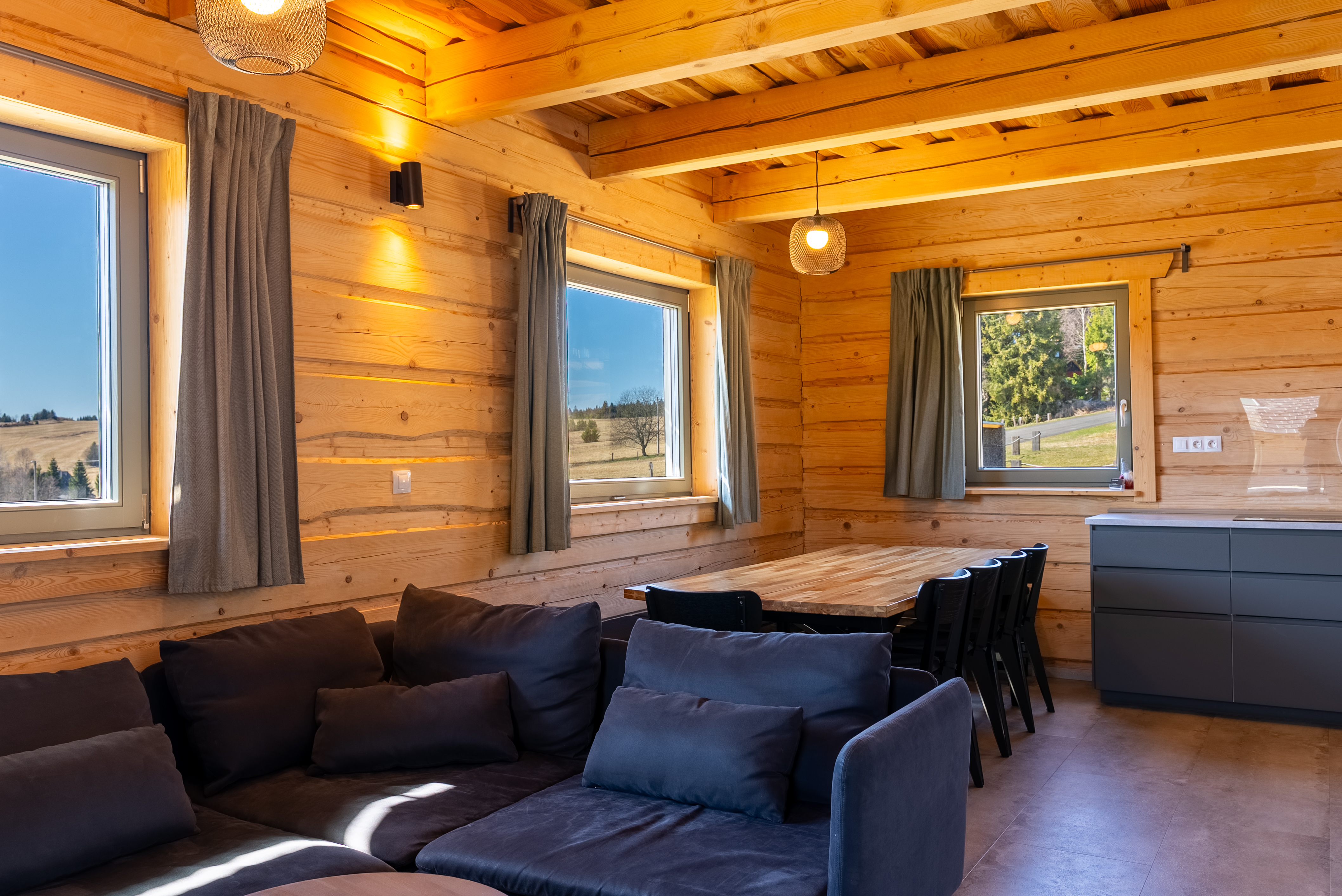 Naše prostřední roubenka je moderně zařízená s veškerým komfortem pro hosty včetně krbových kamen pro radost z pobytu na horách. Lyže, kola i kočárky uložíte v prostorné lyžárně, zaparkujete přímo před domem.